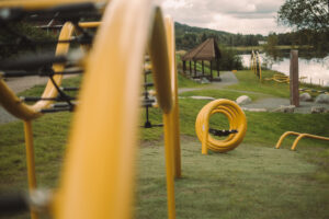 Lekeplassen inkluderer også en balansebro og balansebom som utfordrer barnas balanse og kroppskontroll. Både balansebroen og balansebommen er designet for å gi barna mulighet til å øve på koordinasjon og styrke mens de beveger seg forsiktig fra én ende til den andre. Disse elementene skaper en morsom og engasjerende måte for barna å utvikle fysisk mestring og selvtillit på.